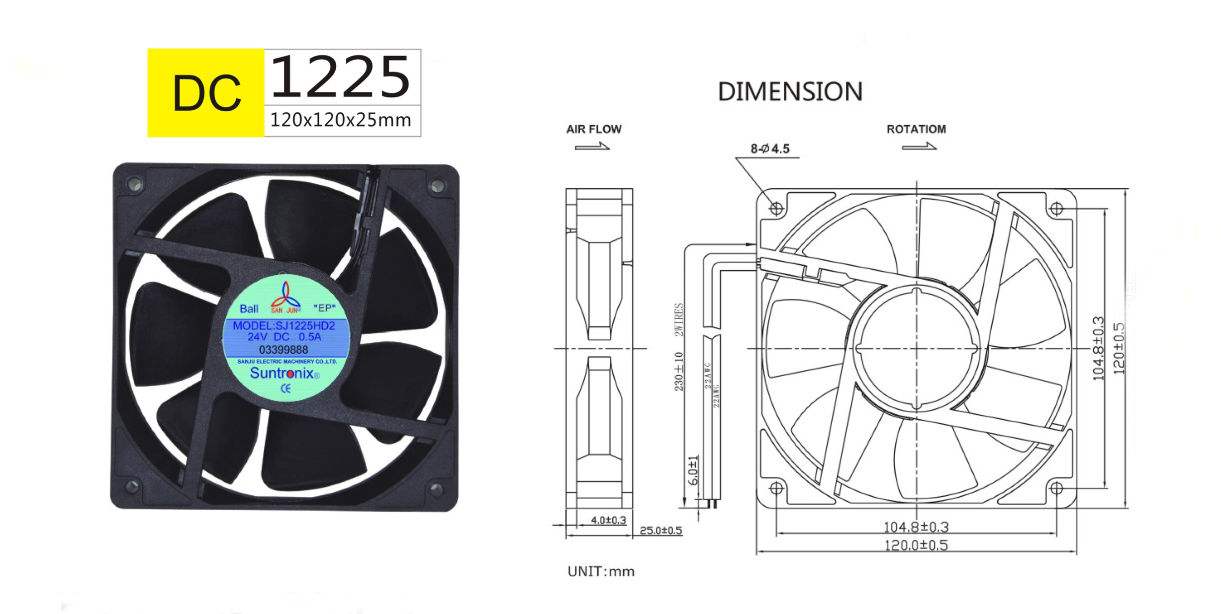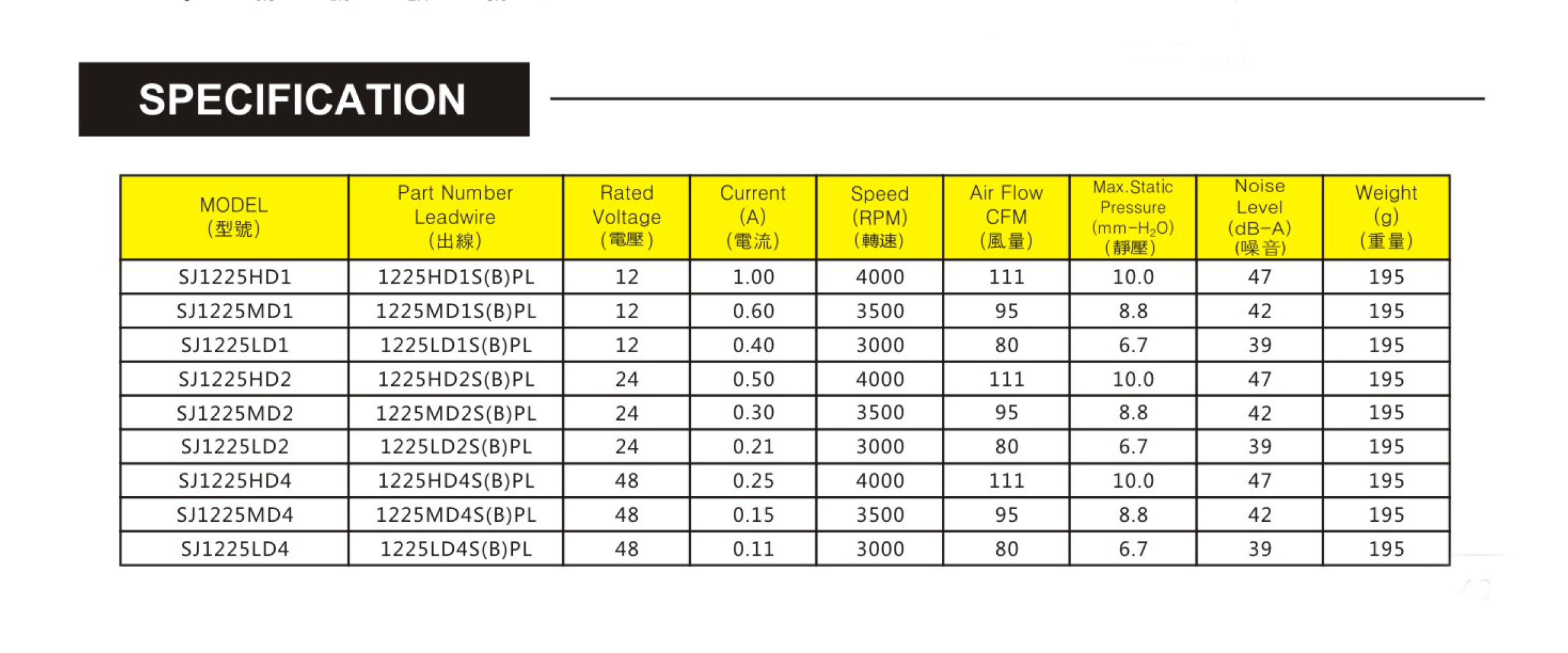尺寸:120x120x25mm 框架: UL94V-0 PBT 軸承: 含油軸承& 雙滾珠軸承 電壓:DC 5V 12V 24V 48V 壽命:50 000Hours at 25℃--滾珠軸承 30 000Hours at 25℃--含油軸承 工作溫度:-10℃~70℃ 正常濕度 儲存溫度:-40℃~70℃ 正常濕度