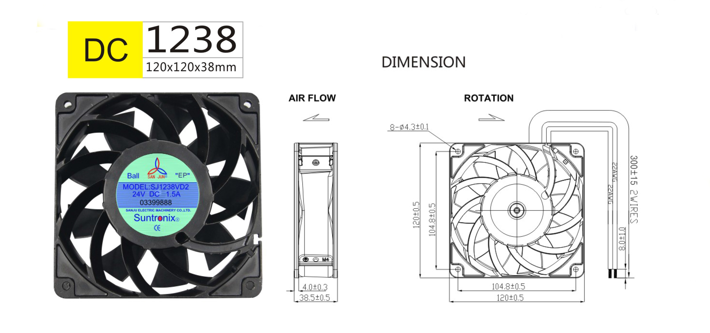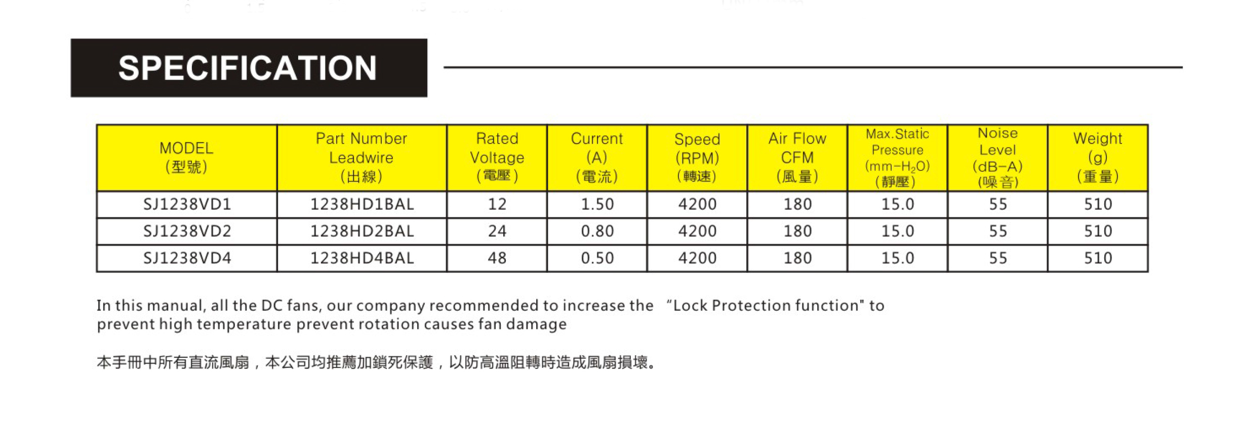 尺寸:120x120x38mm 框架: UL94V-0 PBT 軸承: 含油軸承& 雙滾珠軸承 電壓:DC 5V 12V 24V 48V 壽命:50 000Hours at 25℃--滾珠軸承 30 000Hours at 25℃--含油軸承 工作溫度:-10℃~70℃ 正常濕度 儲存溫度:-40℃~70℃ 正常濕度